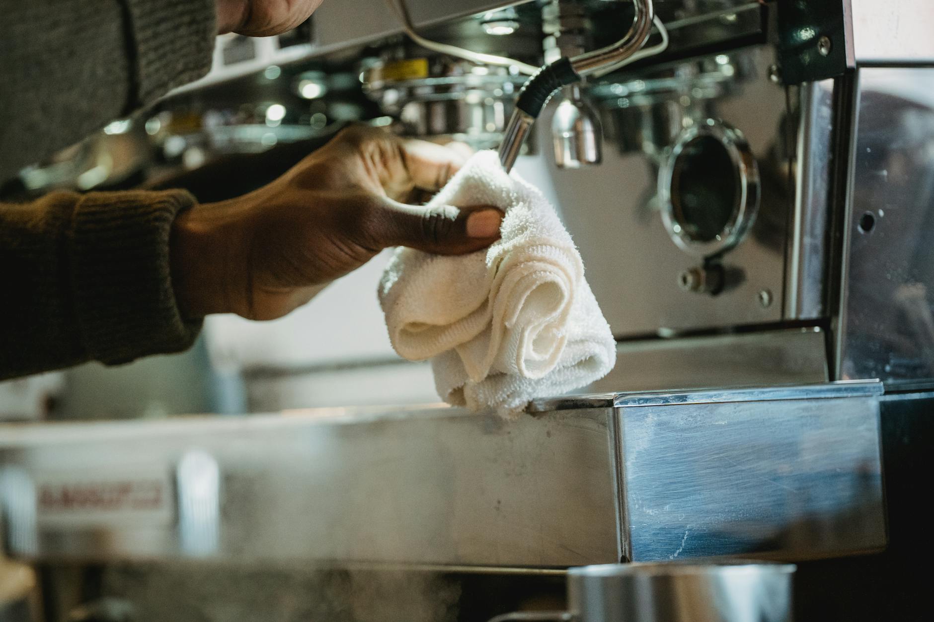 - Steam wand purge and wipe: If you steam milk, this is non-negotiable. Before steaming, point the wand into the drip tray and open the valve for a second to purge any condensed water. Immediately after steaming, wipe the wand with a clean, damp cloth to remove all milk residue, then purge it again to clear any milk that may have entered the tip. Hardened milk is a breeding ground for bacteria and can permanently clog the steam tip.