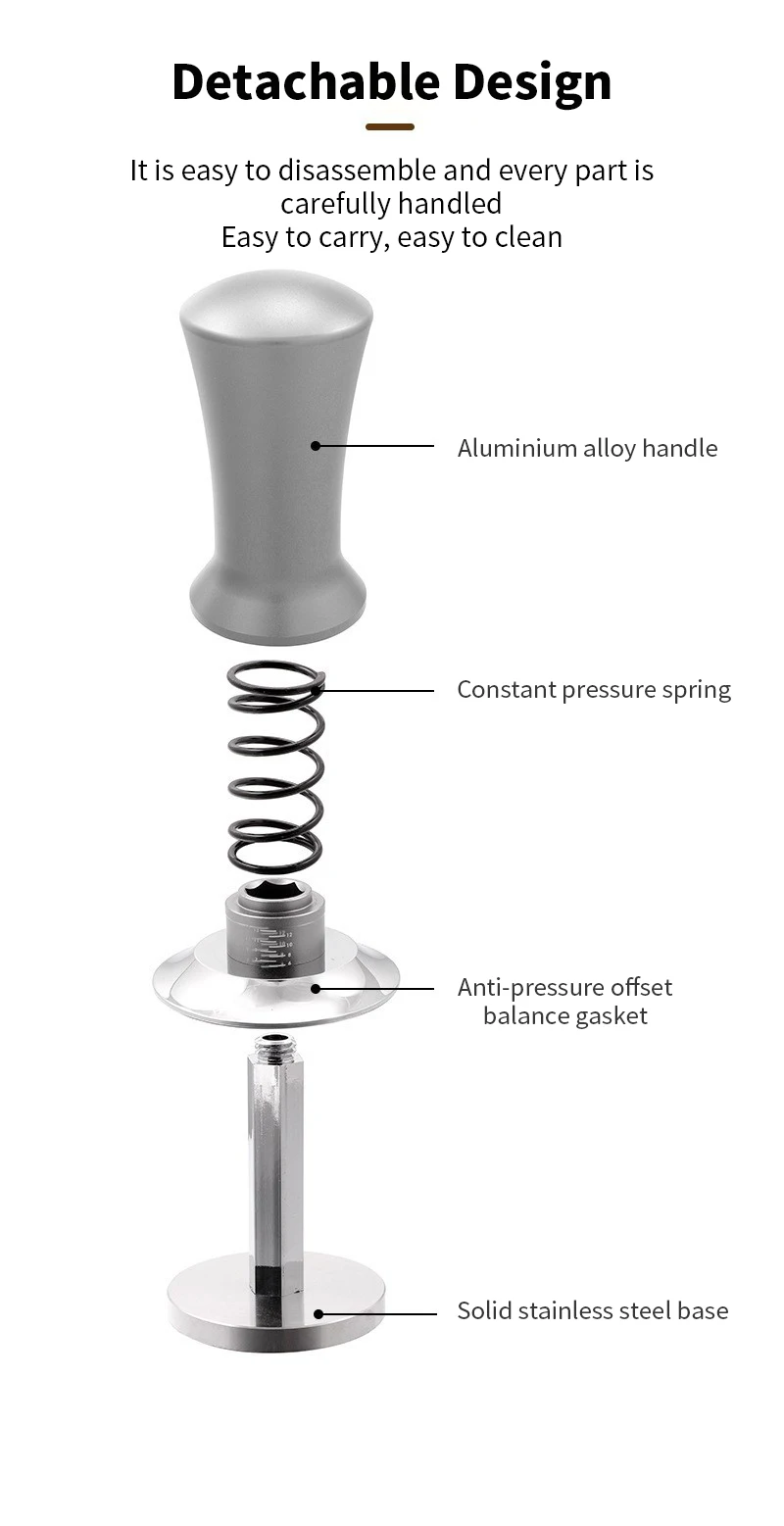 Achieve perfectly consistent tamping every time with this Calibrated Constant Pressure Coffee Tamper. Designed with a built-in spring mechanism delivering 30 lbs (13.5 kg) of pressure, it ensures uniform tamping force — improving espresso extraction, crema, and flavor consistency.