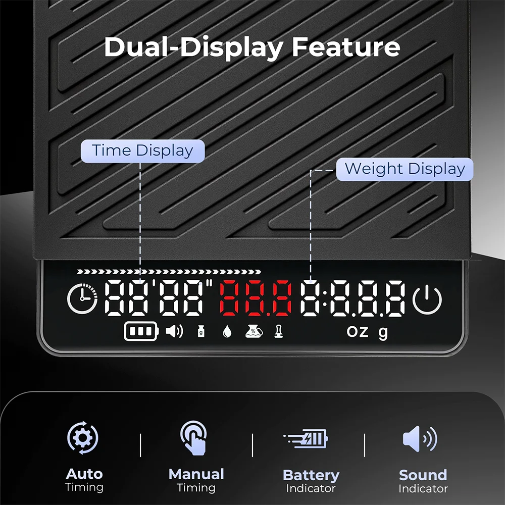 - Use the auto-timing feature to perfect your espresso extraction or pour-over flow.