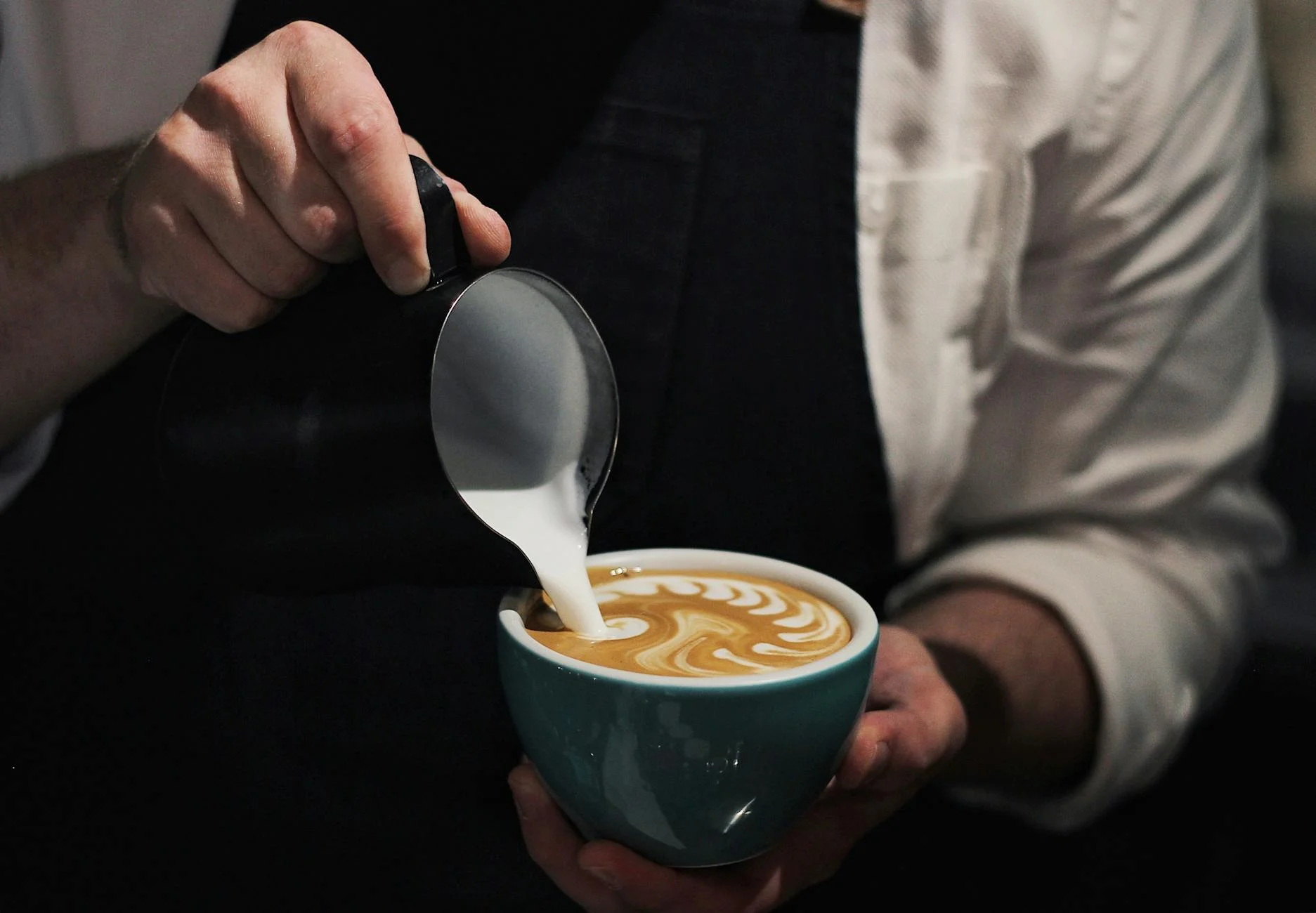 The second cup is for a latte. The barista steams the milk to create a much thinner, more liquid texture with just a small layer of foam on top. The cup is filled almost entirely with liquid milk. Here, the dilution factor is much higher. The espresso is mixed with a large volume of liquid, resulting in a milder, creamier, and more milk-forward beverage. The espresso’s character is softened, blending into the background rather than leading the flavor profile.